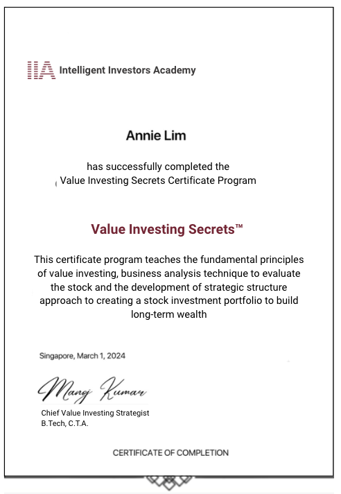 Upon completion of the Value Investing Secrets, you will receive a certificate of participation from Intelligent Investors Academy.Â